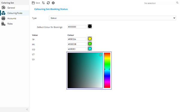 Colours can be entered as HTML colour codes, or selected using a graphical colour selector next to each value. All values must be assigned a colour or they will return the default black in the Resource Planner.