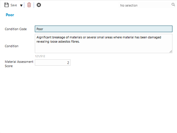 The Asbestos Conditions function allows users to create their own bespoke grading and description of the condition of the Asbestos.