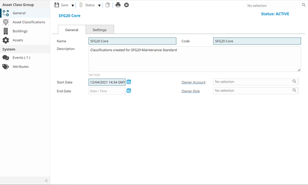 Complete the fields and click Save . Once the Asset Classification Group header has been completed and saved a sub navigation will appear to allow additional entities to be created / assigned.