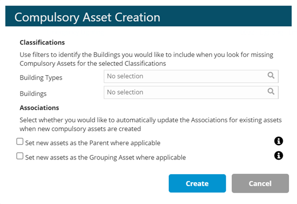 Click Create Compulsory Assets to instigate the creation of any missing Compulsory Assets. At least one compulsory Asset Classification must be selected from the grid before the button is clicked. Multiple selections are permitted. The button will open a window that allows you to apply additional filters and select some preferences for Asset Associations that are set when the compulsory Assets are created.