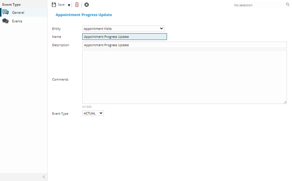 Complete the fields and click Save . Once the Event Type header has been completed and saved a sub menu will appear to allow additional entities to be assigned.