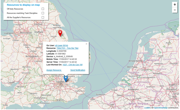 Clicking on a Blue pin will allow either a Notification to be sent to the Resource or the Task to be directly assigned to the Resource