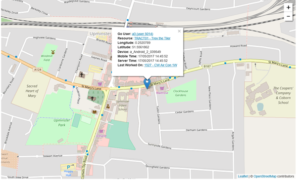 The Evolution Go Mobile User will be shown with a blue pin on the map, clicking on the pin will pop up further information on the specific Location and time this Location was recorded.