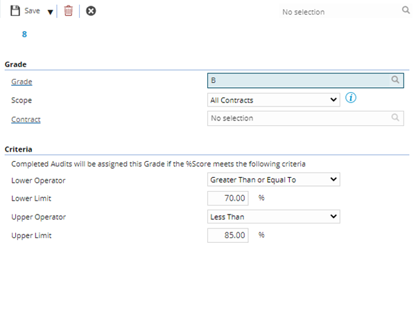 Grade Criteria are defined as upper and lower percentage ranges in order to score the completed Mobile Audits derived from the Mobile Audit Template. Grade Criteria can be applied to Mobile Audits carried out against Tasks in any Contract or for a specific Contract.