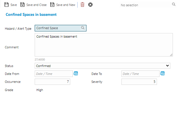 Note: If applying a Hazard / Alert to an entity that has Tasks associated with it a pop up message will appear "Add Hazard / Alert to existing associated tasks?" If yes is selected all Tasks previously raised in the system will have the Hazard / Alert associated with them, if no is selected then only new Tasks raised in the system will have the Hazard / Alert associated with them.