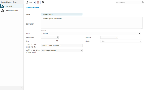 Complete the fields and click Save . Once the Hazard / Alert Type header has been completed and saved a sub navigation will appear to allow additional entities to be viewed.