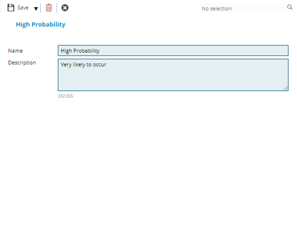 To add a new Project Risk Probability click New , to edit an existing Project Risk Probability click Edit