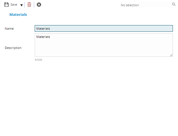 A Purchase Order line item is associated to a type, the default values are Labour or Materials. This list can be extended if required.