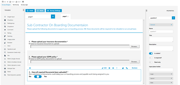 These surveys are designed to control the on-boarding and activation of Suppliers and Resources. Typically they should be completed before a Supplier or Resource can be assigned to a Task or to ensure that the Supplier or Resource is maintaining their credentials and can continue to receive work.
