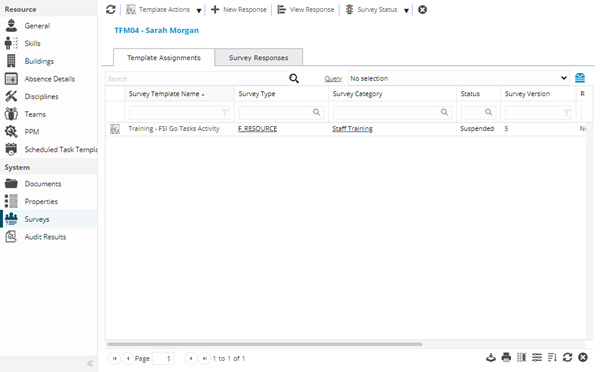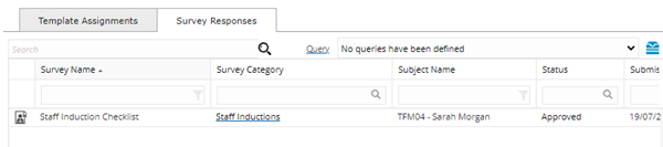 Survey Responses can be viewed, but not updated, by selecting a record in the grid and clicking the View Response toolbar button.