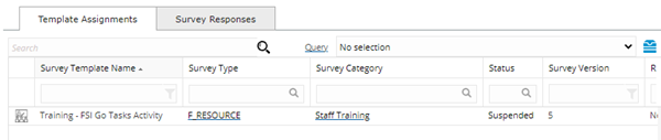 The Template Assignments tab contains a grid of Survey Templates that have been assigned to the current record, or the other way around.