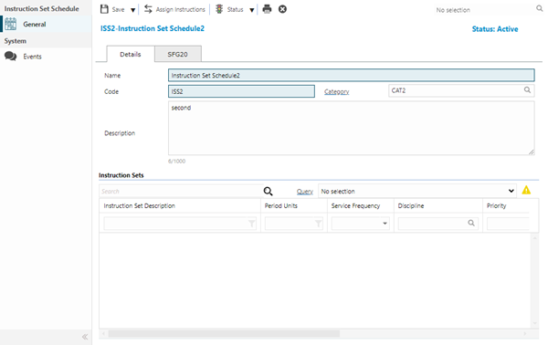 The upper part of the page contains the Instruction Set Schedule fields in two tabs and the lower part contains a grid of Instruction Sets that have been added to the Instruction Set Schedule.