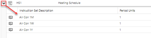 The chevron icon, highlighted below, is a toggle to show or hide the Instruction Sets assigned to the Instruction Set Schedule. The assigned Instruction Sets can be opened directly from the grid, without the need to open the parent Schedule.