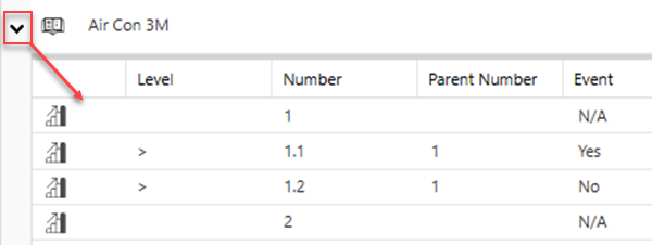 The chevron icon, highlighted below, is a toggle to show or hide the Instruction Steps assigned to the Instruction Set. The assigned Instruction Steps can be opened directly from the grid, without the need to open the parent Instruction Set.