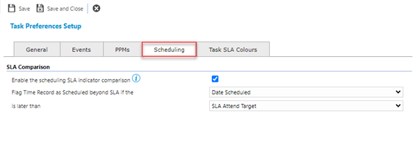 Available from 5.5.0.0 Check box option to Enable or Disable the Scheduling SLA Indicator If enabled, any scheduled Task Time Records will be assessed to determine whether the Time Record is likely to pass or fail one of the Task SLA targets based on the planned date of the Time Record. This Scheduling SLA Indicator can be used in Reports, as a colouring set visual aid in the Resource Planner or added to any pages that list Time Records. Comparison method used: Flag Time Record as Scheduled beyond SLA if the Drop down option 1 value is later than the Drop down option 2 value. |