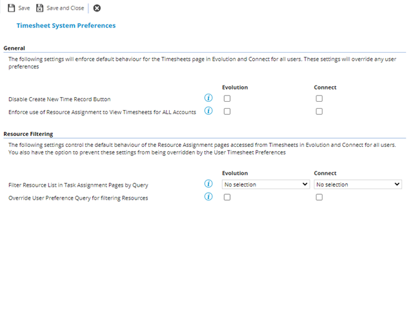 Drop down lists for MRI Evolution and Evolution Connect The drop downs allow selection of any System Query defined for the F_RESOURCE entity. This selection will be used as the default query to restrict the list of Resources shown in the Task Time Record Assignment pages accessed from Timesheets in MRI Evolution and Evolution Connect for all users. Any standard filter criteria relevant to the Task (such as Contract Supplier and Building) or preferences selected by the user on the page (such as On/Off Duty or ignoring Resource Building Links) will still apply. |