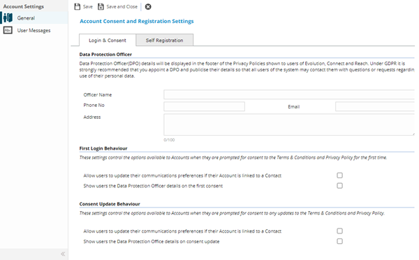 Complete the fields and click Save . Once the Account and Consent header has been completed and saved a sub navigation will appear to allow access to all user messages for Account Consent and Registration.