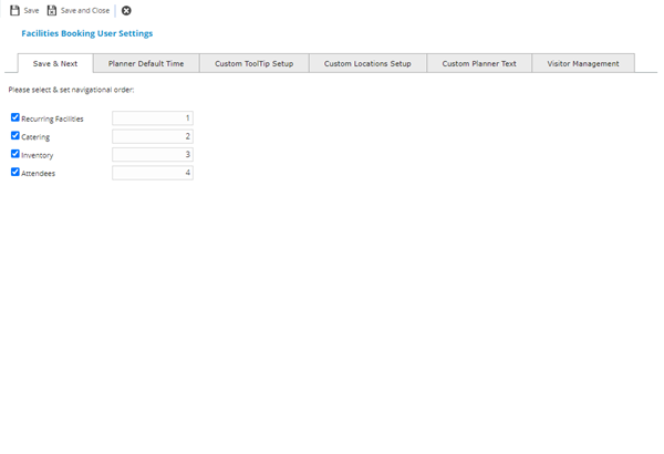 The Save and Next preferences are used to define the working order when adding booking details. From a booking click Save your changes and navigate to the next sub menu . MRI Evolution will use the order set in this tab to navigate to the corresponding menu.