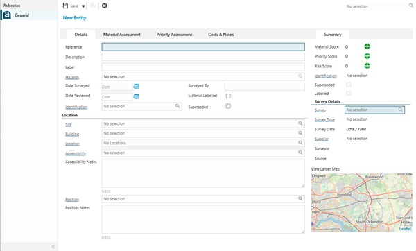 Click the New toolbar button. A pop up window will appear, allowing the addition of an Asbestos Containing Material record.