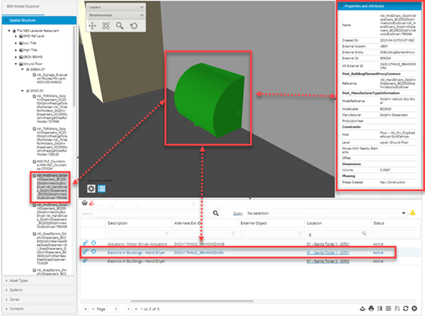 The image below shows a MRI Evolution hand dryer Asset that has been linked to an object in the BIM model. The arrows indicate the BIM Viewer elements related to the object.