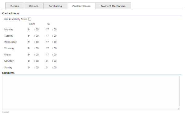 Enter the available hours for the Contract - Leaving From and To times as 00:00-00:00 will count as zero hours availability with the use availability times box checked. |