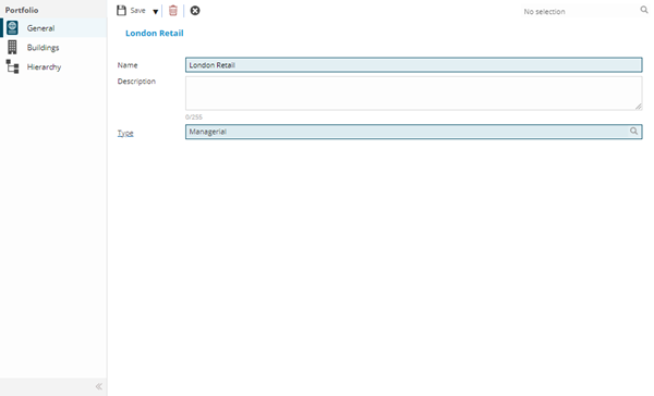 Portfolios can have Buildings assigned to them to aid in filtering and reporting. They can also be placed in hierarchical structure using Portfolio Types e.g. grouping regional Buildings for a regional manger.