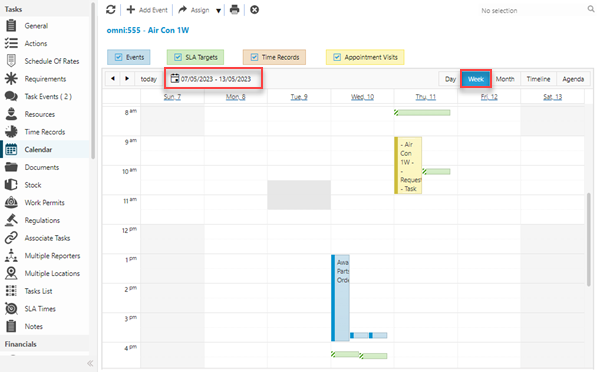 The link will open the Calendar plan sub navigation. The default View will be Week and the date values relevant for the current date will be displayed.