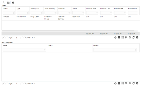 To generate WIP costs, highlight the Task and the WIP Template and click Regenerate Task Type Cost Breakdowns . This will create a Draft WIP Cost Breakdown.