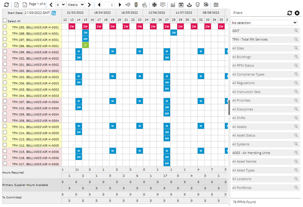 - Hours Required will show the number of hours required to complete the PPMs. Supplier Hours shows the number of hours available per week (calculated from Rotas). The last row shows what the percentage of available hours that would need to be committed to Tasks for that week.