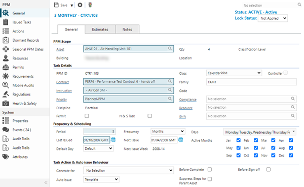 Planned Preventative Maintenance (PPM) Schedules can be created at the point where an Asset is entered into MRI Evolution or may be added from Task Management > PPMs. PPMs are frequency-based work-instances that are carried out to prevent the deterioration and breakdown of an Asset during its lifetime.