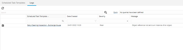 The link will open the Scheduled Task Templates / Logs grid. It is a view only grid view that can be customised and sorted as normal.