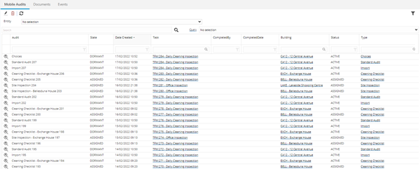 The grid has an Entity drop down filter, used to only display Mobile Audits that have been carried out against a matching Entity value, such as an Asset, in the grid.
