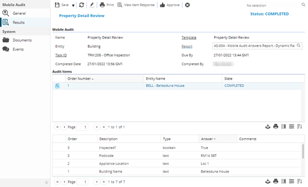 Note: Available from 5.6.0.0 Completed Date and Completed By fields have been removed from the General sub navigation but are present in the Results sub navigation.