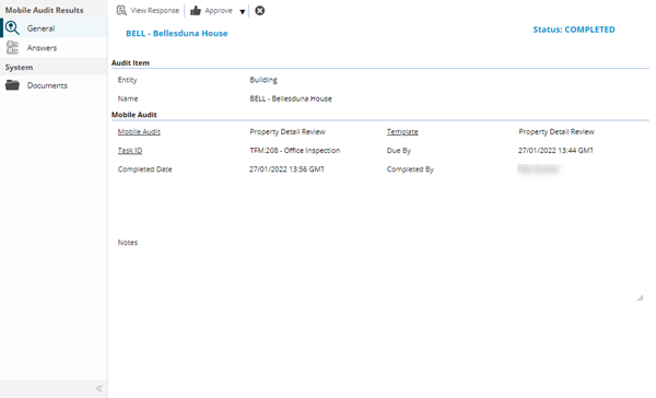 Available from 5.6.0.0 Select an Audit Item in the grid and click to view the completed Mobile Audit in the Survey Viewer Page. |