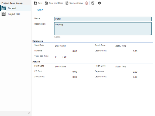 Complete the fields and click Save . Once the Project Task Group header has been completed and saved a sub navigation will appear to allow additional entities to be assigned.