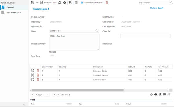 Line items show the values that have been generated for Cost Invoice, they can be opened, checked and amended. New line items can also be added an existing line items can be deleted if required.