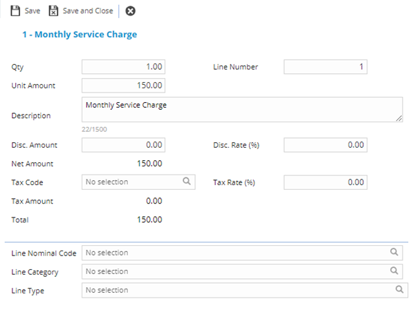 Line item descriptions and costs are generated according to the rule group used to generate the invoice. These can be manually altered if required. If this is a manual invoice the fields will need to be completed to reflect the required invoice,
