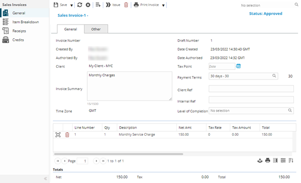 - Once the invoice is ready to be sent to the client it must be activated. The invoice will now show Approved, invoices can be held at this stage until they are ready to be issued.