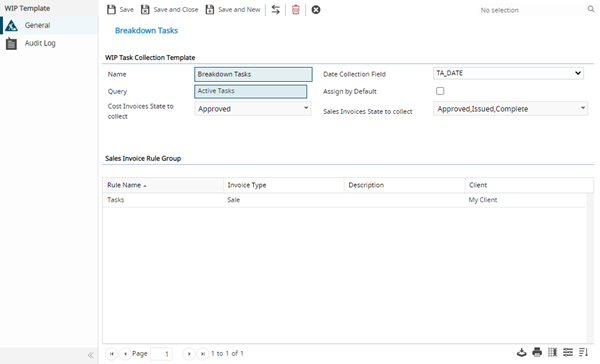 Complete the fields and click Save . Once the WIP Tasks Collection Template header has been completed , the Sales Invoice Rule Groups can be assigned
