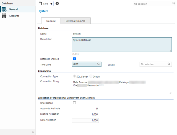 Enter a number of Operational Concurrent licences to allocate to the current Database. The number entered cannot exceed the Accounts Available. Note: This field will be hidden if the Unallocated checkbox is checked. |