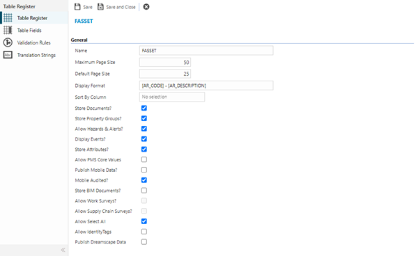 Complete the fields and click Save . From the Table Register header a sub navigation can be accessed to allow additional features to be enabled.