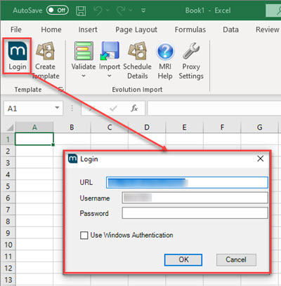 To use the Excel Import Utility you must provide the details of the MRI Evolution system to be updated and to login as an MRI Evolution user account that has been assigned the necessary licence type and Permissions.