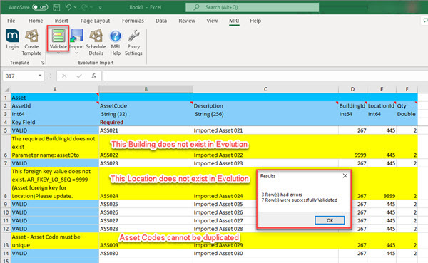 The Validate button allows you to check the entire spread sheet or selected rows, when clicked it will: