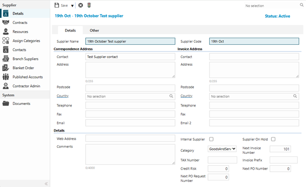 Once enabled against the Suppliers entity, a new sub navigation will become available in the System sub navigation group of the Suppliers input panel: