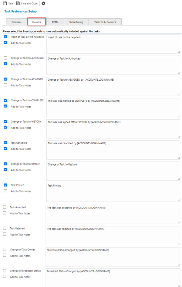 Note: It is imperative to use upper case text for [ACCOUNTS.FULLNAME] and [ACCOUNTS.LOGINNAME] in the Event text of the Events above, where required. These two are special cases since they do not relate directly to the entity that is being updated for the Event but the person that has carried out the action, which the Event is describing.