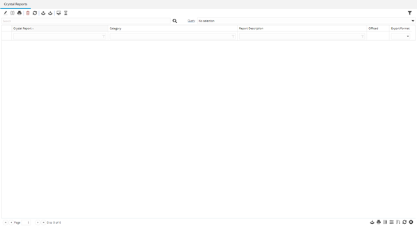 The Crystal Reports grid allows any public or published Crystal Reports to be printed. Crystal Reports can only be viewed from here.