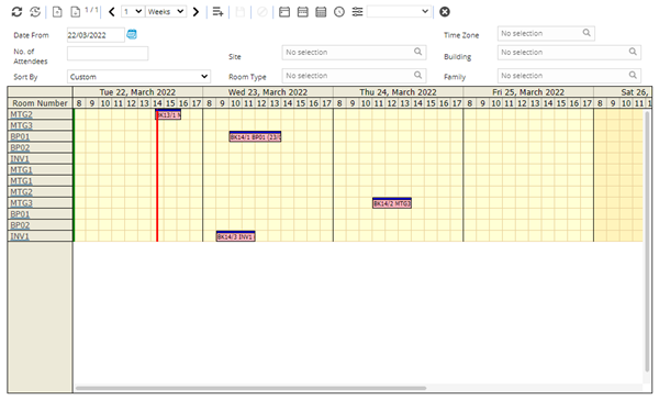 The Planner visually shows bookings for a given date, over a given time period (day, week or month) and can be filtered by the Building, Room Type or the number of Attendees.