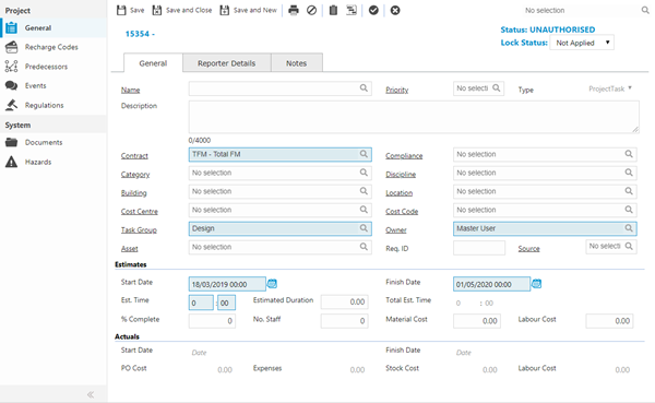 Complete the fields and click Save . Once the Project Task header has been completed and saved a sub navigation will appear to allow additional entities to be assigned.