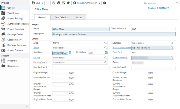Project Tasks can be set default values to speed up the process of creation. When a Project Task is subsequently raised the default values will auto-populate.